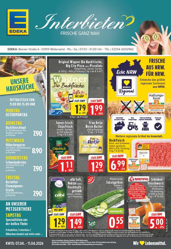 Angebote Die Angebote der Woche sind gültig vom 06.04. bis zum 11.04.2026. Bild zum Vergrößern anklicken oder hier herunterladen PDF-Download Bild zum Vergrößern anklicken oder hier herunterladen PDF-Download Bistro Bild zum Vergrößern anklicken oder hier herunterladen PDF-Download